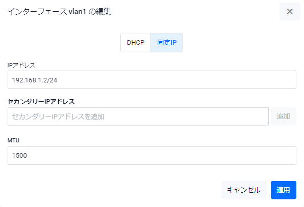 | IPアドレス | 対象インターフェースに設定するIPv4アドレスを「192.168.101.1/24」の形式で入力してください。空欄(未定義)の状態で「適用」ボタンを押した場合は該当インターフェースのIPv4アドレスが削除されます |