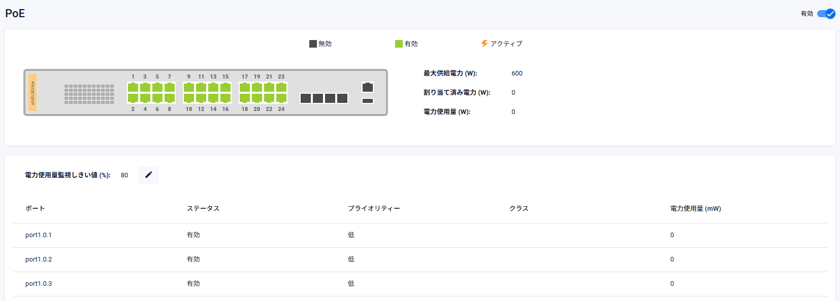 | 無効・有効スライドボタン | システム全体でPoE給電機能の無効・有効を切り替えます |