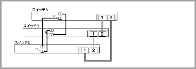 3台以上の構成の場合も同様で、たとえばスイッチAのスタックポート27をスイッチBのスタックポート28に、スイッチBのスタックポート27をスイッチCのスタックポート28に、スイッチCのスタックポート27をスイッチAのスタックポート28に接続します。