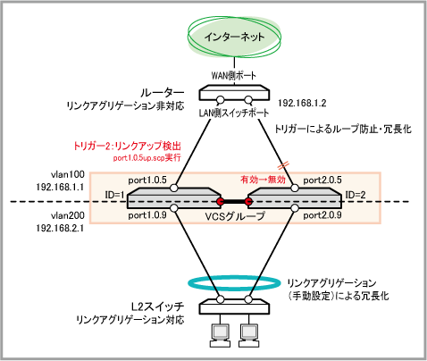 対向の2ポート(ルーター側の2ポート)は、ルーターのLAN側スイッチポートを想定しています。ルーターにスイッチが内蔵されていない場合は、VCSグループとルーターの間にスイッチをはさむ必要があります。