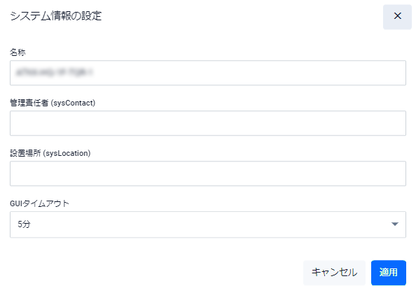 | 管理責任者 (sysContact) | 管理責任者(連絡先)を入力してください。255文字以内。半角英数字と記号( ! # $ % & ' ( ) * + , - . / : ; < = > @ [ \ ] ^ _ ` { | } ~ )が使用可能ですこの値は「SNMP設定」の「全体設定」画面からも編集可能です |