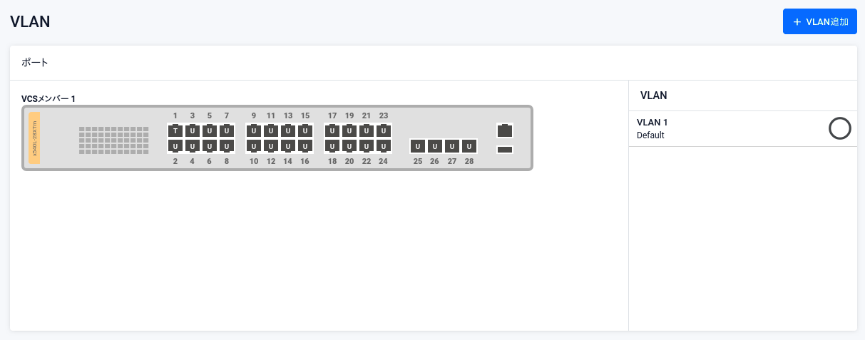 | ポート | 各スイッチポートのタグ設定と所属VLANが視覚的に表示されます。 ・無色U - 初期設定ポート(明示的なVLAN設定のない、vlan1所属のタグなしポート) ・U - タグなしポート(アクセスポート) ・T - タグ付きポート(トランクポート) 各ポートの所属VLANは、該当ポートにマウスカーソルを当てると表示されるポップアップによって確認できます。 また、タグなしポートでは所属VLANが「VLAN」一覧の色でも示されます。 一方タグ付きポートは、「VLAN」一覧で選択中のVLANに所属していれば背景色が該当VLANの色になり、そうでなければ背景色が濃い灰色になります。 ポートをクリックまたはマウスカーソルを当てることで該当ポートのタグ設定と所属VLANの変更およびネイティブVLANの設定をすることもできます。詳細は「タグ設定・所属VLANの変更・ネイティブVLANの設定」をご覧ください |