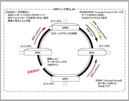 MRMが両ポートから送出したMRP_Testメッセージが、一定の時間内に送信したポートではない方のポートで受信できなかった場合、MRMはリングに障害が発生したと判断します。なお、MRMは、障害の回復を検出するため障害発生中もMRP_Testメッセージを通常どおり送出し続けます。