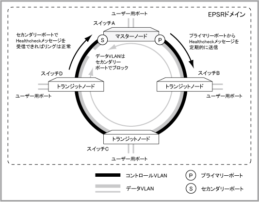 マスターノードは、コントロールVLAN上において、プライマリーポートからHealthcheckメッセージを定期的に送出します。一定の時間内にセカンダリーポートでHealthcheckメッセージを受信できなかった場合は、リングに障害が発生したと判断します。マスターノードは、障害発生中もHealthcheckメッセージを送出し続け、セカンダリーポートで再び受信できるようになると、リングが障害から回復したと判断します。