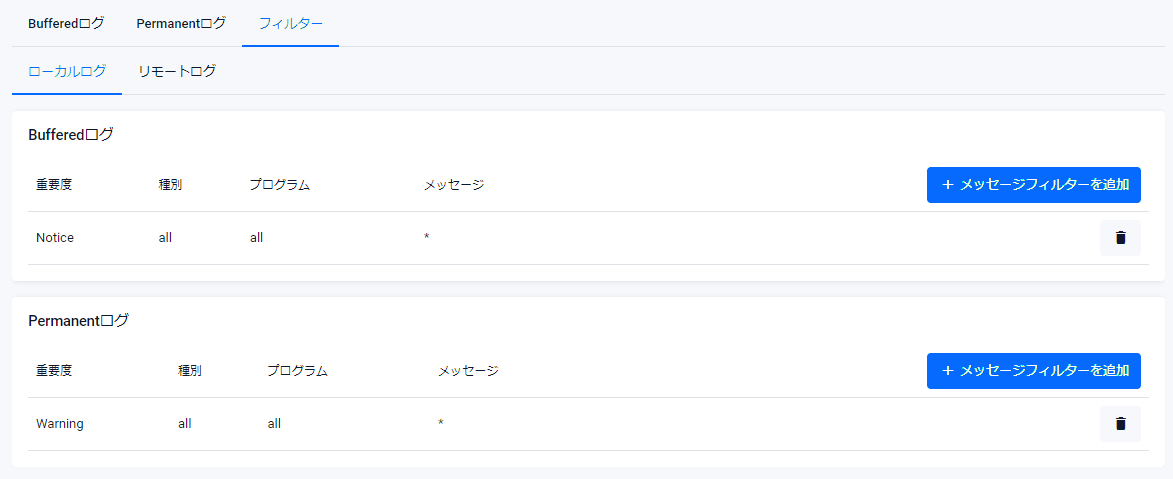 | フィルター | ローカルログやリモートログに対してメッセージフィルターの設定ができます |