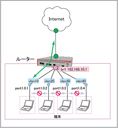 awplus(config)# interface vlan10,vlan20,vlan30,vlan40 ↓ awplus(config-if)# bridge-group 1 port-protected ↓ awplus(config-if)# exit ↓