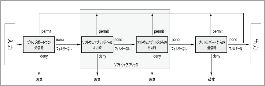Note1つのソフトウェアブリッジ上で複数のMACフィルターを使用する場合は、処理順序が最後になるMACフィルター以外のデフォルトアクションを「none」に設定する必要があります。これには、default-actionコマンドを使います。