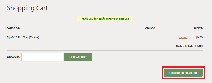 - 認証コードを入れると、以下の画面が表示されるので、「Proceed to checkout」をクリックします。