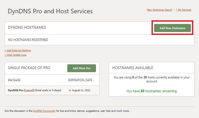 - 「DynDNS Pro and Host Services」ページが表示されるので、「Add New Hostname」をクリックします。