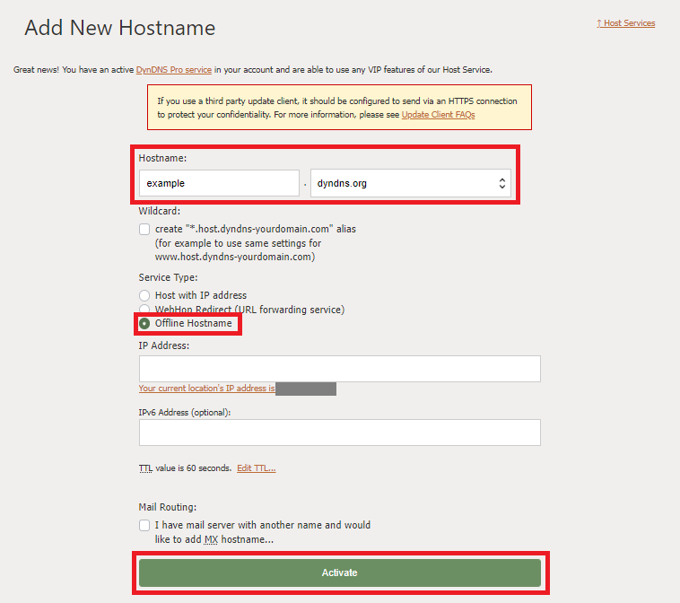 - ホスト名を入力し、「Offline Hostname」をチェックし、「Activate」をクリックします。
