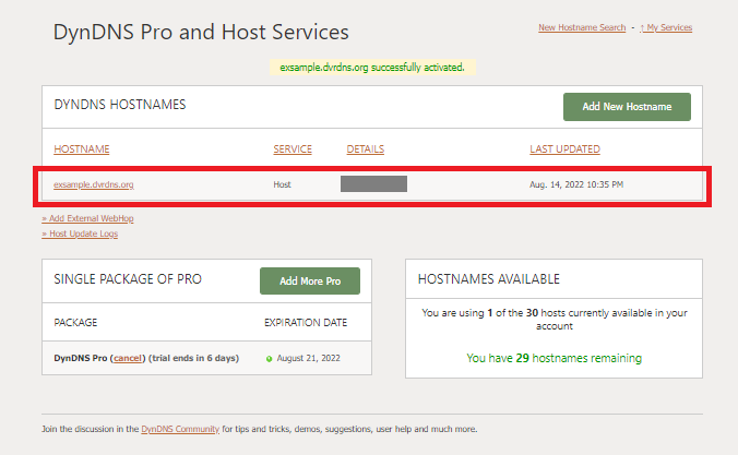 「DynDNS Pro and Host Services」ページにもホスト名が追加されています。