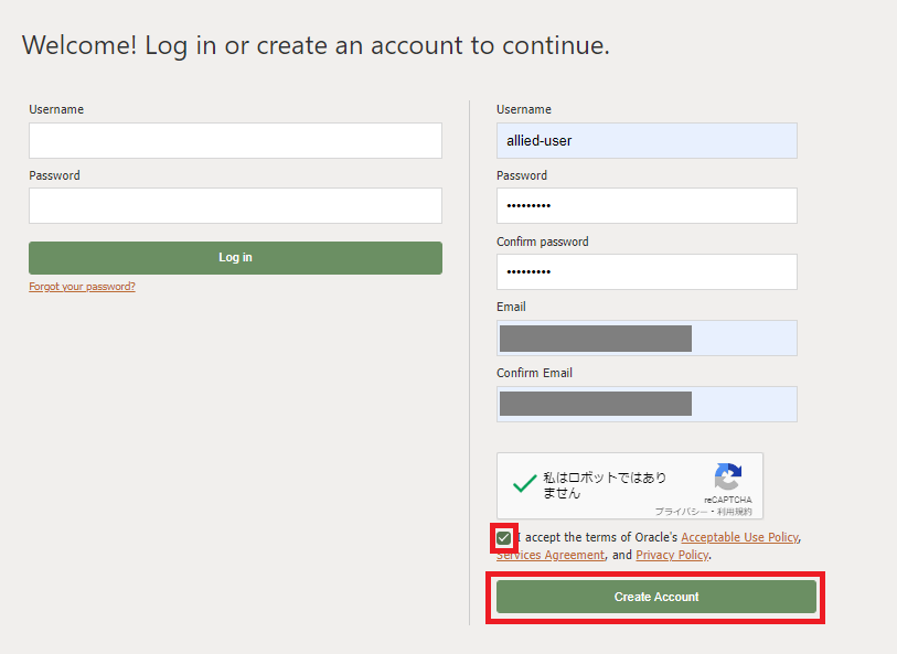 - 必要な情報を入力し、「I accept the terms of Acceptable Use policy, Services Agreement, and Privacy Policy.」にチェックを入れ、「Create Account」をクリックします。