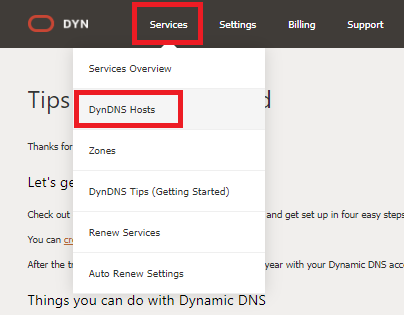 - 上部メニューの「Services」>「DynDNS Hosts」をクリックします。
