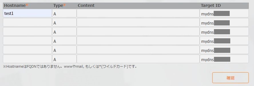 ホスト名。ホスト名はデバイスが使用しているドメインを把握するための管理用として登録(DDNS更新リクエストには未使用) |
