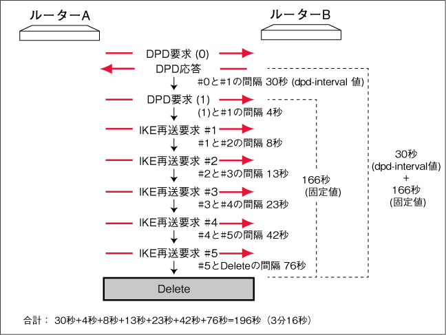 IKEv2の場合、最後に成功した(応答があった)DPD要求から dpd-interval + 166 秒後にSAが削除されます。