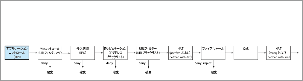 Noteルール「30」~「60」は、アプリケーションシグネチャデータベースを更新するため、本製品からインターネットへのDNS/HTTPS/SSL/TCP通信を許可するものですが、DPI機能の有効時には事前定義済みアプリケーション「dns」よりもDPIアプリケーション「dns」が優先されるため、ルール「30」を機能させるために本製品からインターネットへの通信についても、未判別のトラフィック(undecided)を許可する必要があります(ルール「70」)。