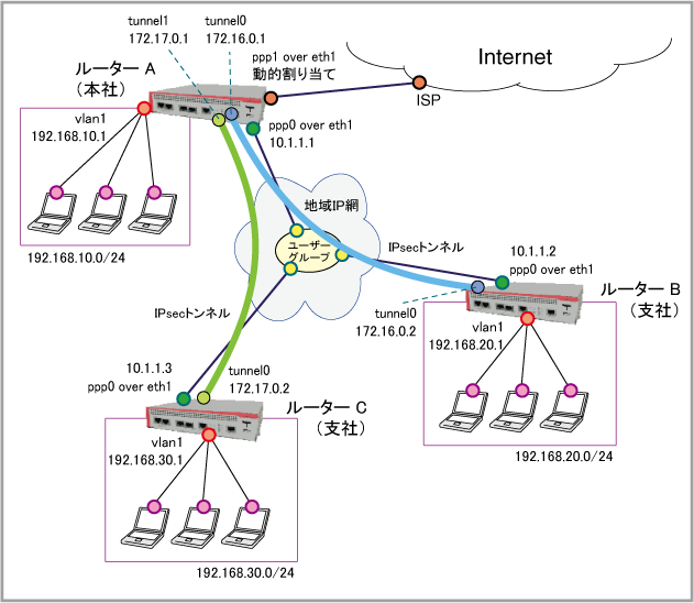 | WAN側(ppp0)IPアドレス | 10.1.1.1/32 | 10.1.1.2/32 | 10.1.1.3/32 |