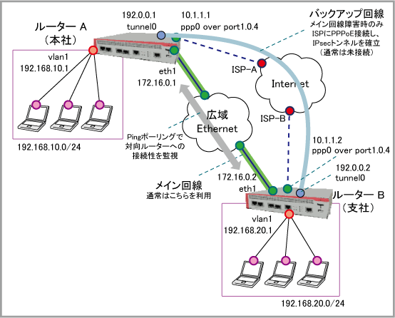 メイン回線として広域Ethernet、バックアップ回線としてインターネットVPNを使用している2つの拠点間でPingポーリング機能を使用し、メイン回線の障害発生時に自動的にバックアップ回線に切り替える設定例です。