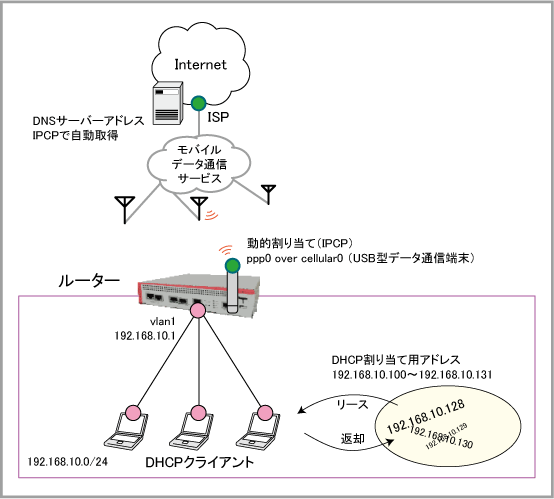 この例は、接続時にアドレスを1つ割り当てられる端末型の基本設定です。