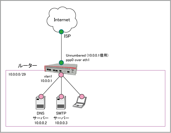 ISPから割り当てられているアドレス(10.0.0.0/29)は8個(10.0.0.0~10.0.0.7)ですが、ネットワークアドレス(10.0.0.0)、ブロードキャストアドレス(10.0.0.7)、ルーター自身のvlan1アドレス(10.0.0.1)にそれぞれ1個ずつ消費されるため、端末に設定できるアドレスは10.0.0.2 ~ 10.0.0.6の5個となります。
