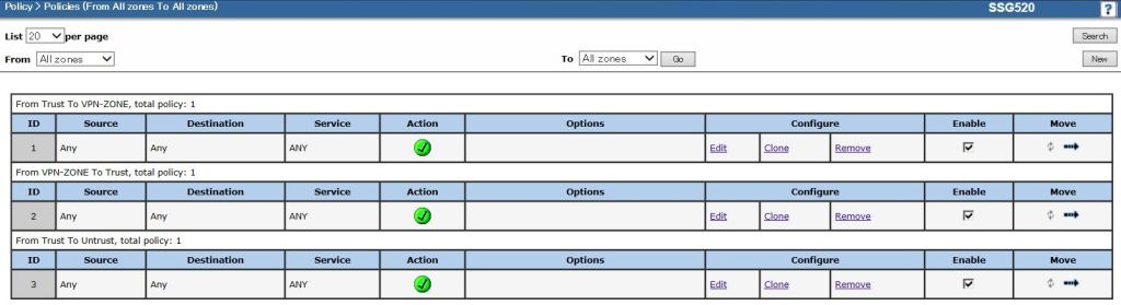 まず、LAN→IPsecトンネル方向の設定を行うため、以下のようにFrom/ToのZoneを選択して[New]をクリックします。