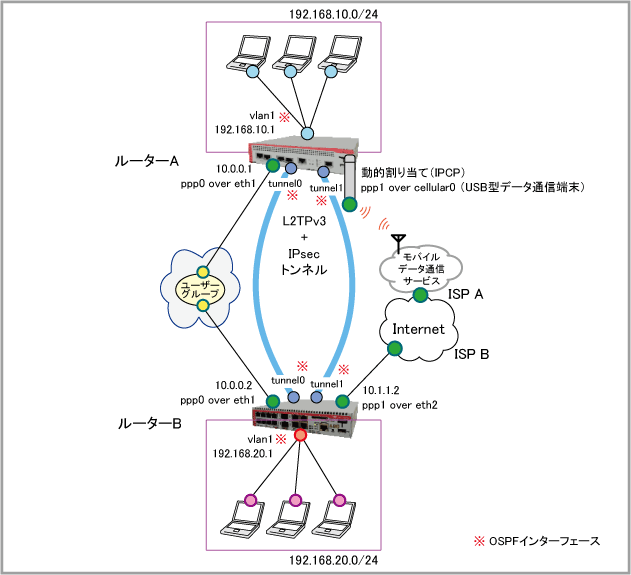 | WAN側(ppp0)IPアドレス(1) | 10.0.0.1/32 | 10.0.0.2/32 |