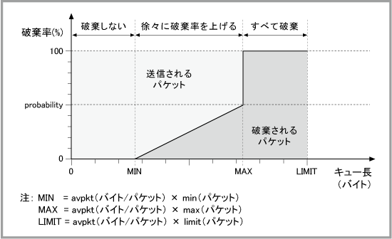 awplus(config-tc)# red-curve RED-drop avpkt 256 min 15 max 50 limit 100 probability 20 ↓この例では、平均パケットサイズ(avpkt)を256バイトと想定しているため、MIN、MAX、LIMITの実際値は次のようになります。