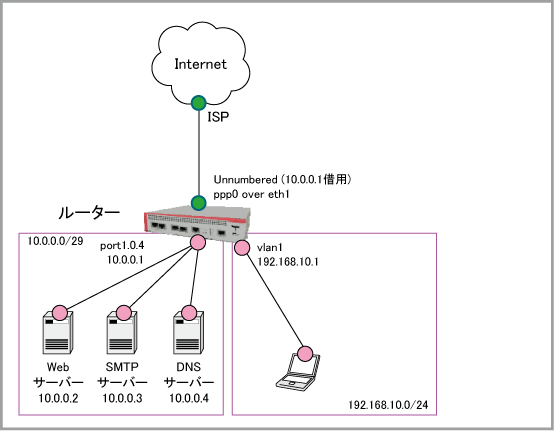 WAN側インターフェースはUnnumberedで運用します。ルーター自身がWAN側にパケットを送信するときは、グローバルサブネット側のインターフェースアドレス(10.0.0.1)を借用します。