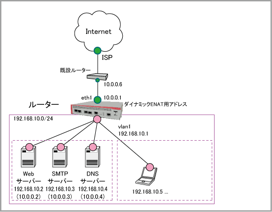 この例では、既設ルーターの背後にファイアウォール兼NATボックスとして本製品を導入する環境を想定しています。インターネットサービスプロバイダー(ISP)からは、複数のグローバルIPアドレスをブロック単位で固定的に割り当てられているものとします。ダイナミックENATで本製品のLAN側クライアントがインターネットにアクセスできるようにし、ファイアウォールで外部からの不正アクセスを防止します。また、LAN側に置かれたサーバー(プライベートアドレスで運用)を、スタティックNATで外部に公開します。