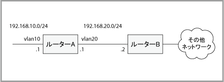 ここでは例として、次のようなネットワークにおけるルーターAとBの設定を示します。