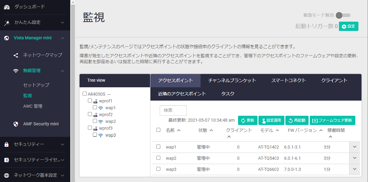 登録したAPのステータスは、「無線管理」>「監視」画面で確認できます。