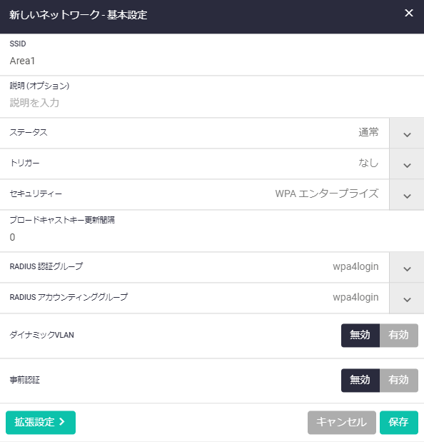 無線ネットワーク「1」のSSIDは「Area1」、セキュリティー方式はWPAエンタープライズとします。