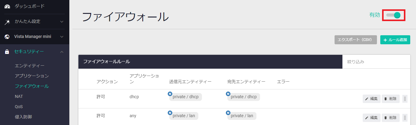 設定が終わったら、「ネットワークサービス」>「DHCPサーバー」画面右上のスイッチをクリックして、DHCPサーバーを有効化してください。