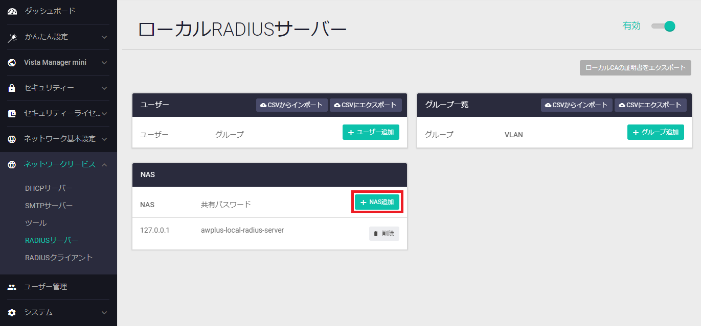 「ネットワークサービス」>「RADIUSサーバー」画面右上のスイッチをクリックして、RADIUSサーバーを有効化してください。