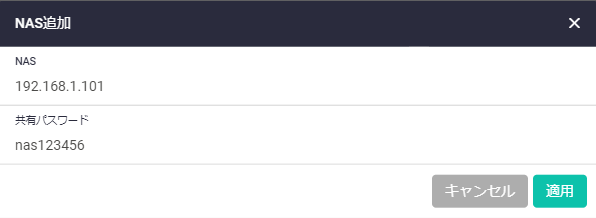NASを登録するには、「NAS」追加画面で下記の表のように設定し、「適用」をクリックします。