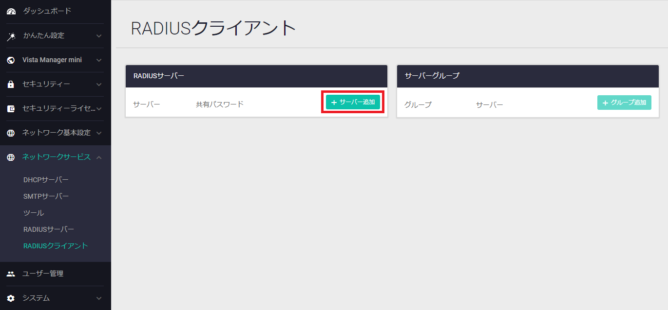 「ネットワークサービス」>「RADIUSクライアント」画面で「サーバー追加」をクリックします。