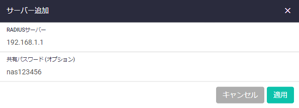 「RADIUSサーバー」に「192.168.1.1」、「共有パスワード」に「nas123456」を指定し、「適用」をクリックします。