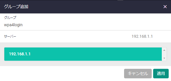 「ネットワークサービス」>「RADIUSクライアント」画面で「グループ追加」をクリックし、表示された下記の画面で「グループ」に「wpa4login」、「サーバー」に「192.168.1.1」を指定して、「適用」をクリックします。