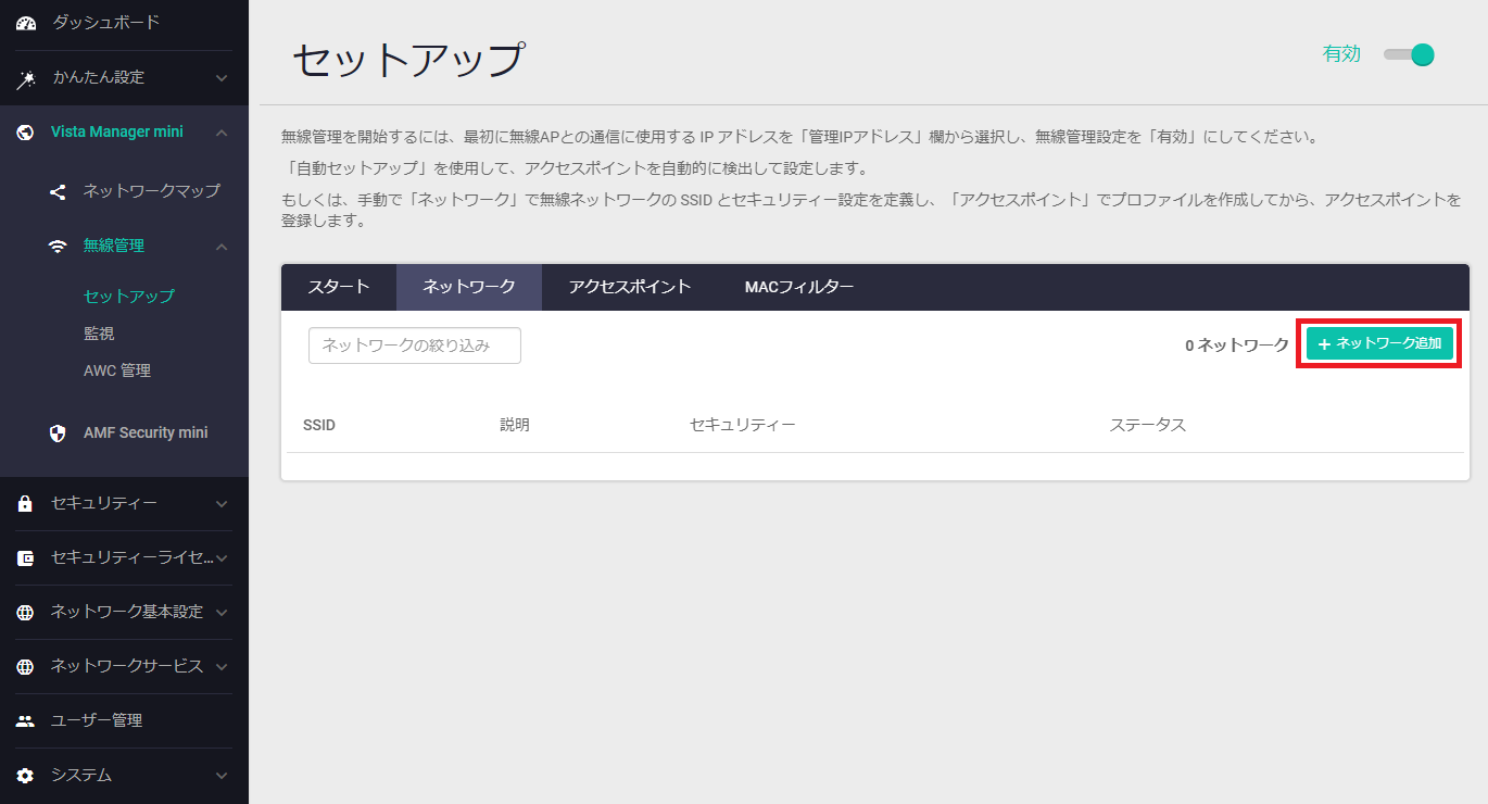 「無線管理」>「セットアップ」画面で「ネットワーク」タブを選択し、右上の「ネットワーク追加」をクリックします。