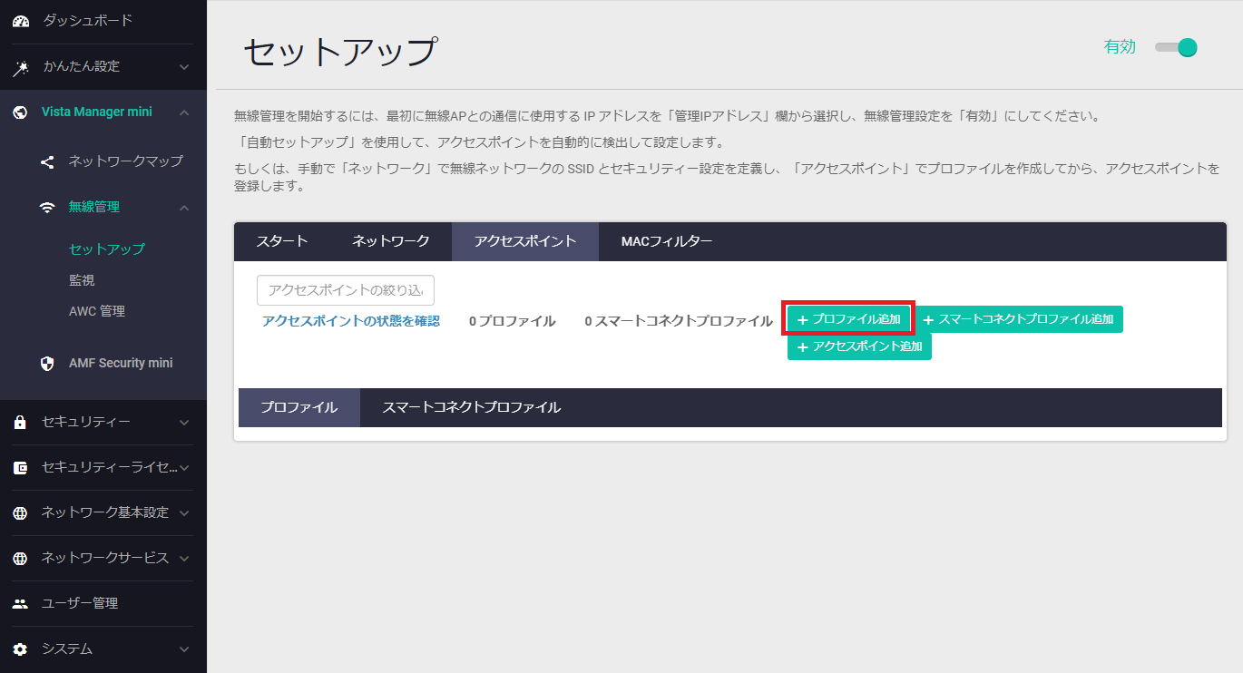 「無線管理」>「セットアップ」画面で「アクセスポイント」タブをクリックし、「プロファイル追加」をクリックしてください。