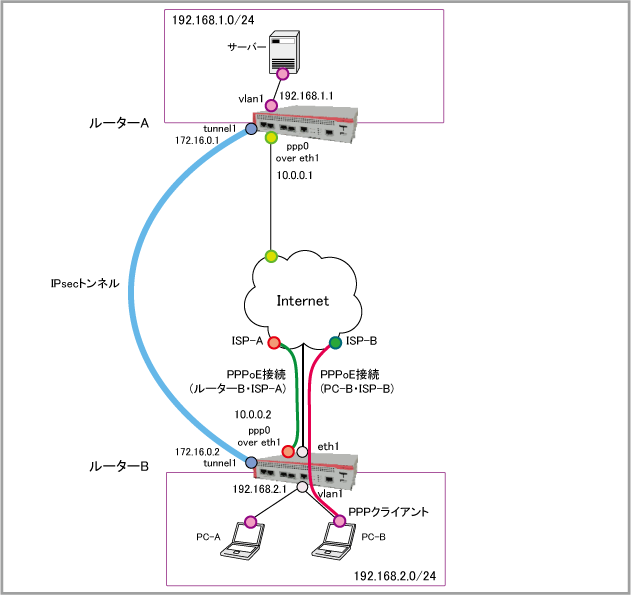 | WAN側(ppp0)IPアドレス | 10.0.0.1/32 | 10.0.0.2/32 |