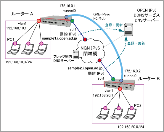 設定例集#65: ダイナミックDNSサービスを利用したホスト名(FQDN)によるフレッツ網内VPN接続(ルーティング構成)