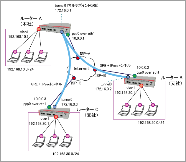 | LAN側(vlan1)IPアドレス | 192.168.10.1/24 | 192.168.20.1/24 | 192.168.30.1/24 |