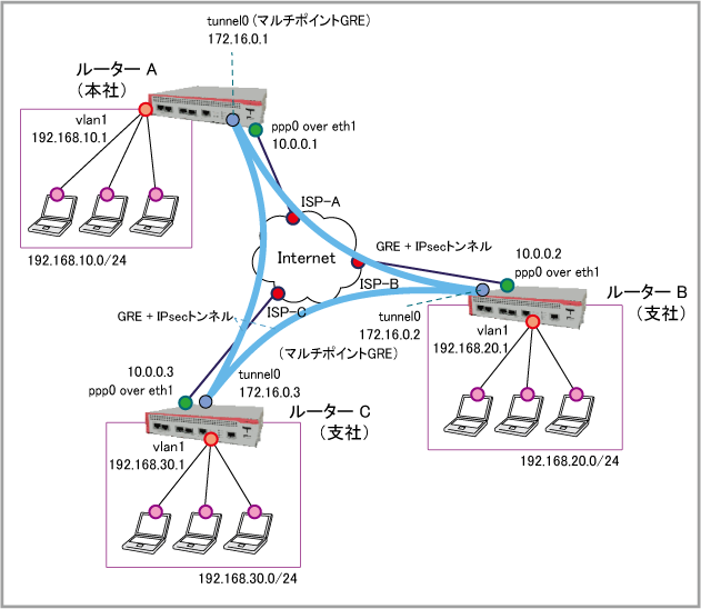 | LAN側(vlan1)IPアドレス | 192.168.10.1/24 | 192.168.20.1/24 | 192.168.30.1/24 |