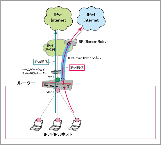 MAP-EによってIPv4 over IPv6トンネルを構築し、NTT東日本・NTT西日本が提供するフレッツ 光ネクスト回線を経由してIPv4インターネットに接続するための設定例です。