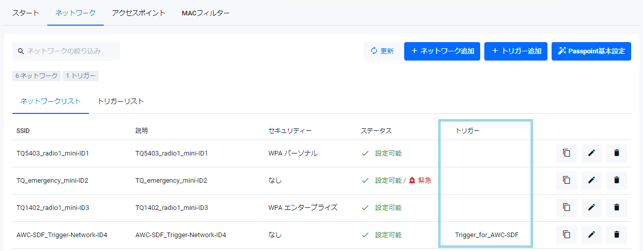 | トリガー | 対象無線ネットワークに関連付ける無線トリガーを指定します。無線トリガーを関連付けた無線ネットワークは、トリガーが有効化されたときだけ有効になります |