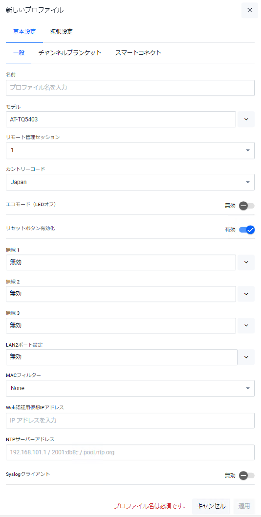 | 名前 | 無線LANコントローラーの管理下に登録するアクセスポイント名を指定します。256文字以内。半角英数字と記号( ! # $ % & ' ( ) * + , - . / : ; < = > @ [ \ ] ^ _ ` { | } ~ )を使用可能です |