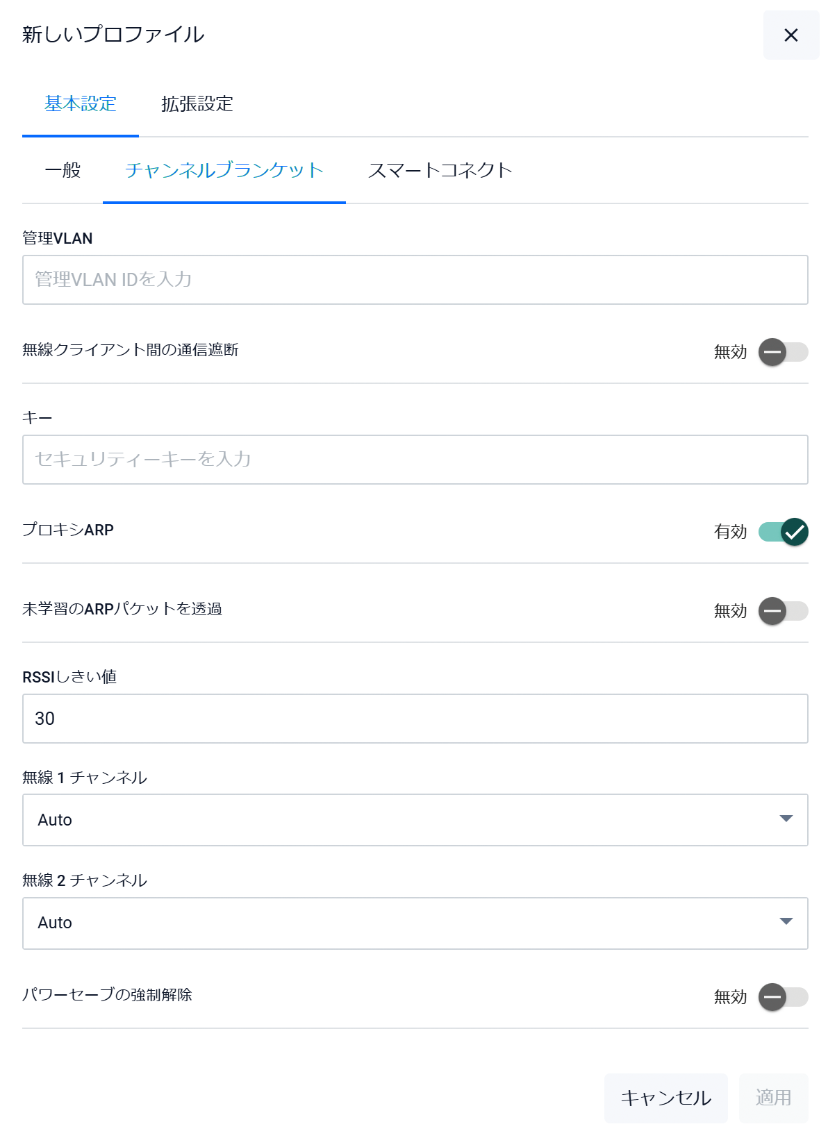 | チャンネル | 自動チャンネル選択の候補チャンネルを設定します。チャンネルブランケットおよびスマートコネクトを使用する場合、本設定は「all」から変更しないでください |