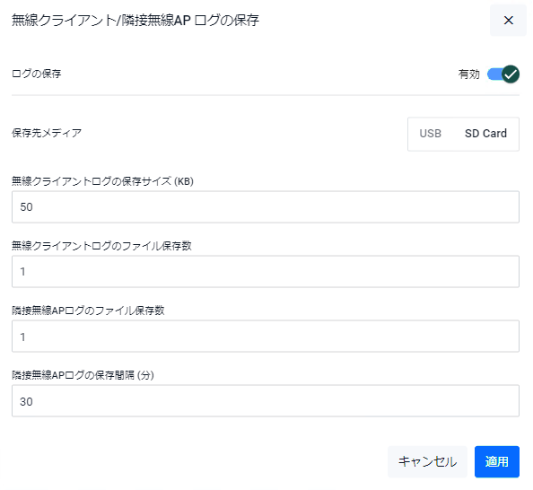 | ログの保存 | 無線クライアント・隣接無線APログ機能の無効・有効を選択します |