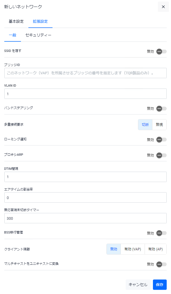 | 無応答端末切断タイマー | 無線APに対し通知が行われずにいなくなった無線クライアントを切断するまでの時間を指定します。30~3600(秒)の範囲で指定できます。デフォルトは「300」です。 |
